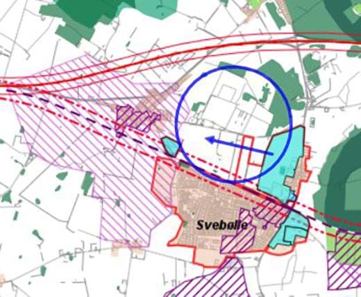 Svebølle har potentiale som aflastningsområde for Kalundborg for stærkt transportafhængige erhverv på vej- og jernbanenettet - særligt i lyset af den planlagte opgradering af rute 23. I Svebølle er et relativt stort erhvervsareal nord for byen med restrummelighed til lettere erhverv. Der er gode muligheder for erhvervsudvidelser i tilknytning til Svebølle erhvervspark. Byen har fortsat disponible arealer til til både tungere og lettere erhverv, men det kan være relevant at overveje perspektiverne for yderligere udlæg fremadrettet. Derfor udpeger denne kommuneplan perspektiver for et muligt udviklingsområde og udviklingsretning (nederst på siden).