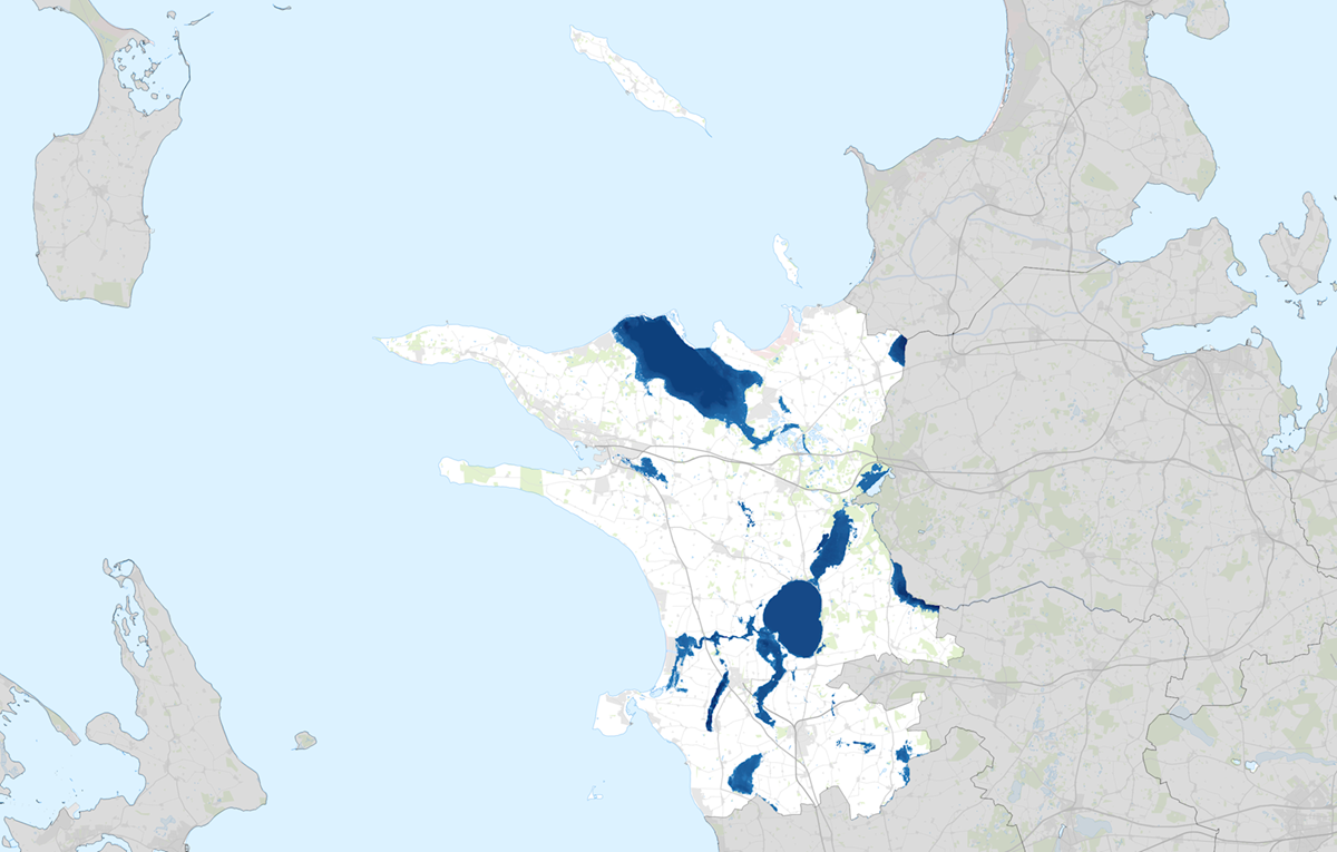 kort 5.2.a - Udpegede, oversvømmelsestruede områder ved 100-års hændelser for regnvand, havvand og vandløb.