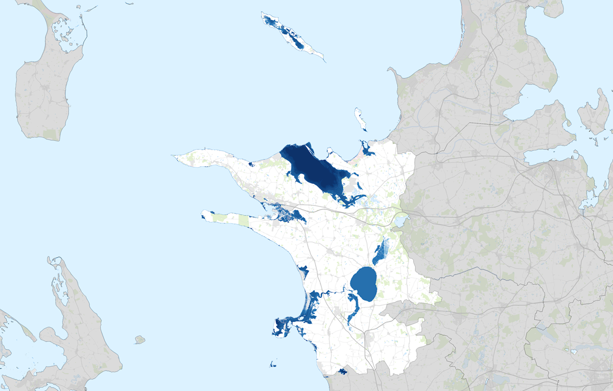 Kort 5.2.d - Områder, som er i risiko for oversvømmelse fra havvand ved en 5-, 20- og 100-års hændelse.