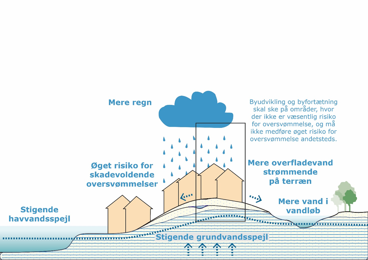 Billede 2: Kommuneplanens udpegning af oversvømmelsestruede områder og retningslinjer om afværgeforanstaltninger skal medvirke til, at byudvikling m.v. sker på robuste steder, og at der etableres de nødvendige afværgeforanstaltninger for både at sikre det nye, men også sikre, at omgivelserne ikke stilles værre. En byudvikling, særligt på barmark, vil oftest betyde en øget befæstelse med mere og hurtigere overfladevand strømmende på terræn.