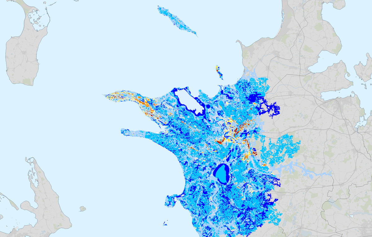 - Vanddybde i lavning (vanddybder under 100 mm målt i døgnnedbør ved en 100-årshændelse vises ikke)