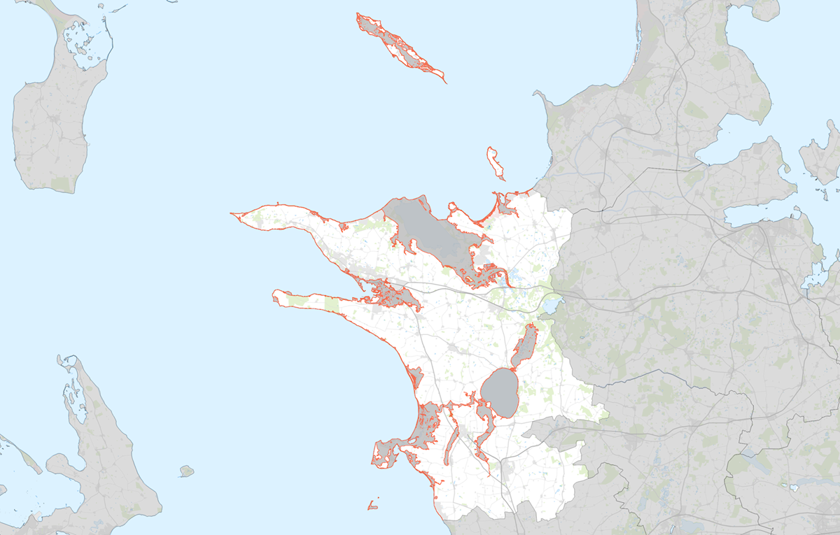 På kort 5.2.c er det vist, hvor man kan forvente at vandet vil samle sig ved en 20- og 100-års hændelse jf. data fra Kystdirektoratet.