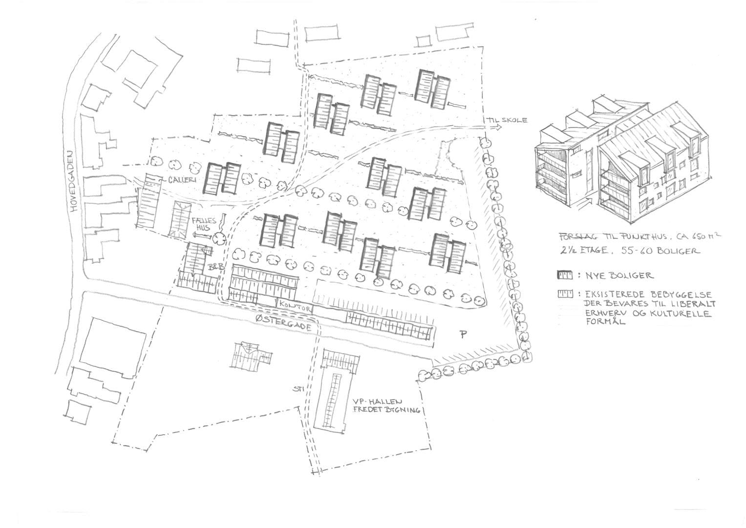 Den fremtidige bebyggelse, på arealet bag virksomhedens kontorbygninger mv. kan evt. udføres som punkthuse placeret i mindre klynger med 50-60 boliger i et åbent parkstrøg.