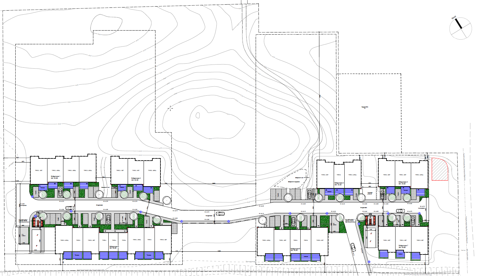 For at trække det omkringliggende landskab ind i området skal hegn imellem de enkelte boliger etableres som levende hegn i form af klippede hække. Der kan plantes træer langs den interne boligvej for at understøtte et grønt udtryk inden for rammerne af bebyggelsen.