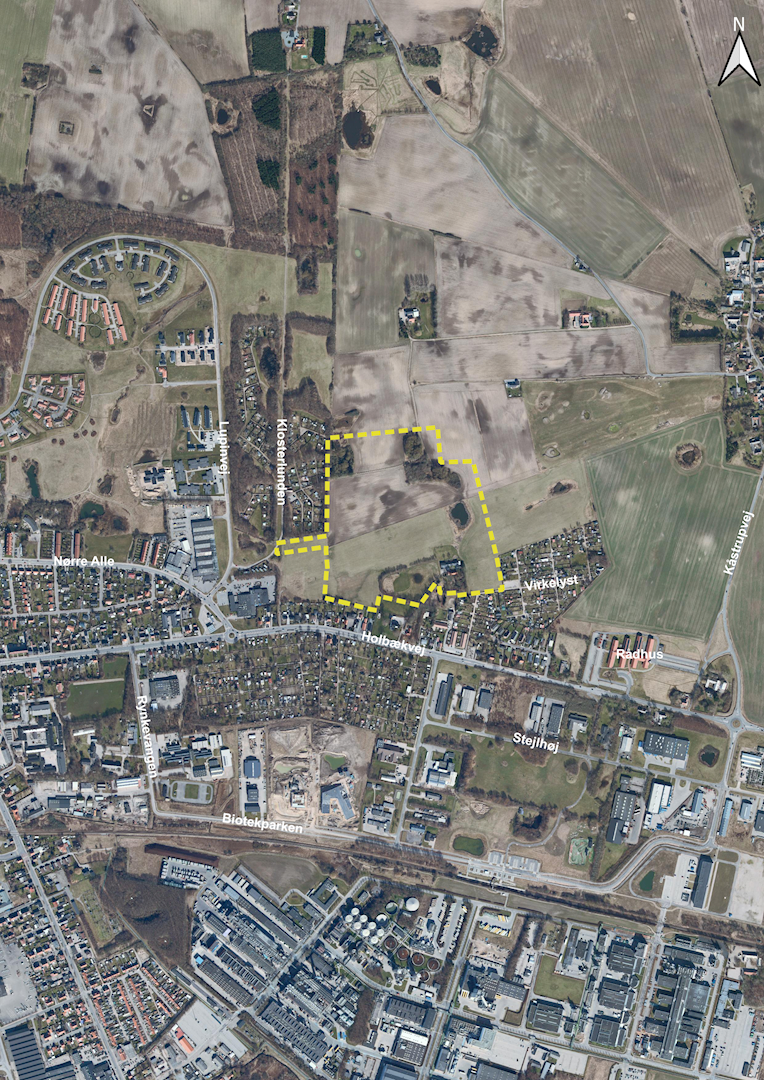 Planområdet afgrænses mod nord og øst af det åbne land. Mod vest grænser lokalplanområdet op mod en dagligvarebutik og Klosterlunden, som er en mindre vej med tilkobling til Lupinvej. Ved lokalplanområdets nordvestlige afgrænsning ligger et større kolonihavehusområde. Mod syd grænser området op til den eksisterende boligbebyggelse og kolonihavehuse ved Holbækvejs nordside.