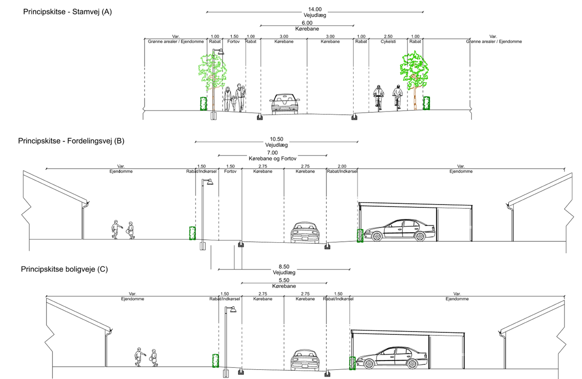 Princip for henholdsvis stamvej (øverst) samt fordelingsvej og boligvej (nederst)