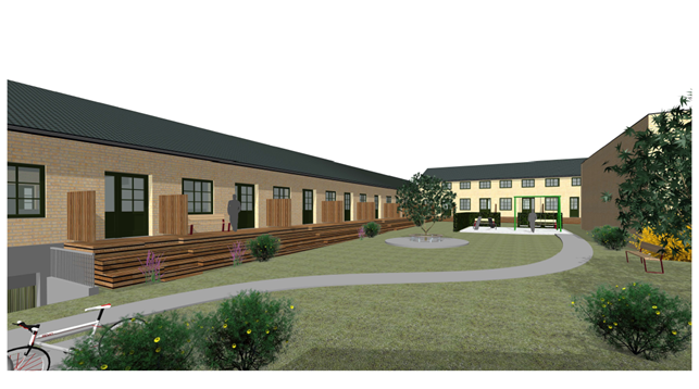 I ejendommens gårdrum mellem bygningerne skal der ligeledes etableres fælles gårdrum med etablerede opholdspladser og beplantning, så gårdrummet opleves med naturpræg, når man kigger ud i det fra boligerne. Der skal bygges en mur, som afskærmer gårdrummet fra erhvervsområdet. Der skal i forbindelse med dette etableres beplantning, som kan klatre op ad muren og give naturpræg. Alle boliger skal have direkte adgang fra boligen til et eller begge fælles udearealer som hører til ejendommen.
