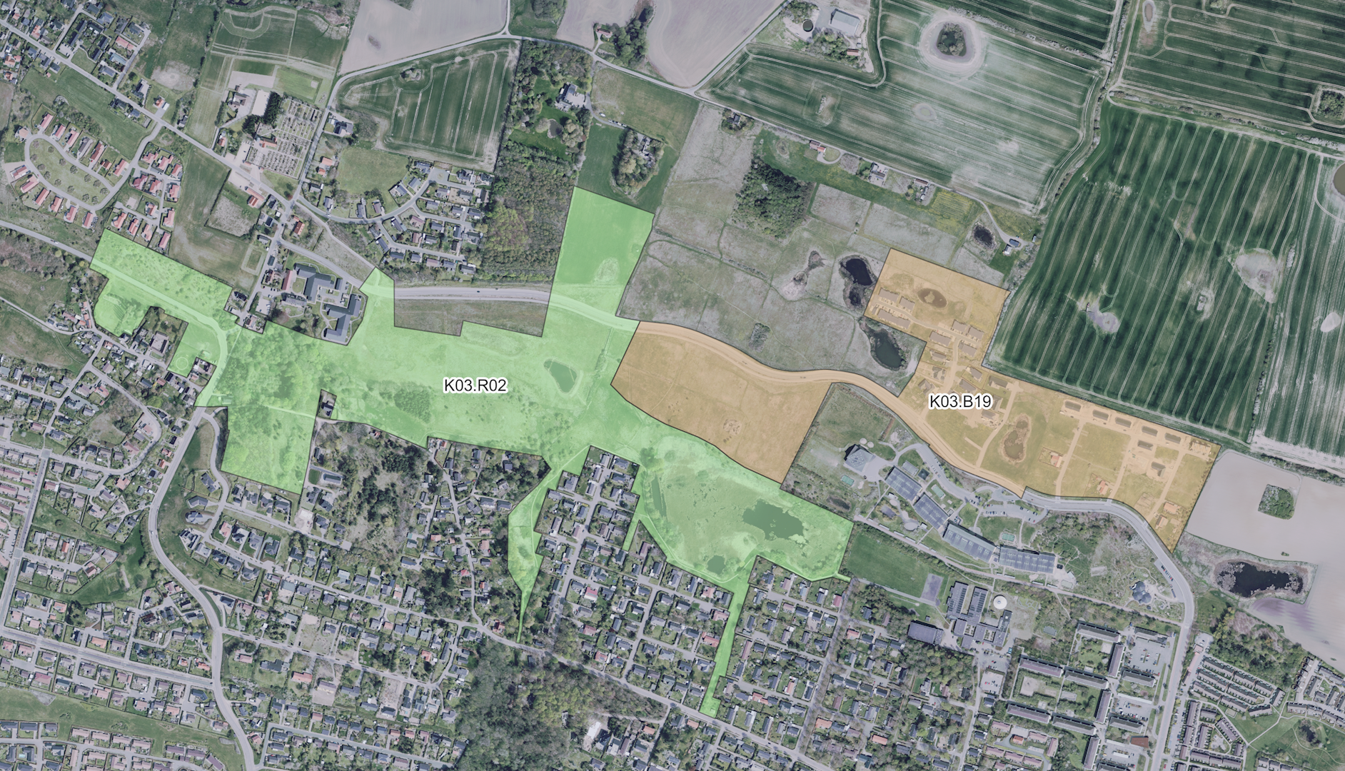 Kortet nedenfor viser eksisterende rammeområder (K03.B19 og K03.R02), som ændres gennem kommuneplantillægget: