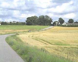 Foto: 4 Ved ankomst i byen afdækker terrænet og træerne kirken, der flot bliver byens dignitar. Set fra Eskebjergvej.