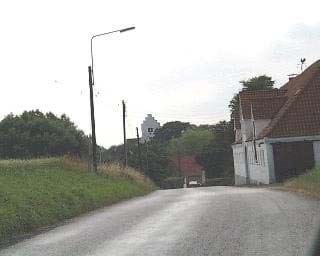 Fra Gierslevvej: Kirketårnet i Gierslev indvarsler og placerer byen forude.