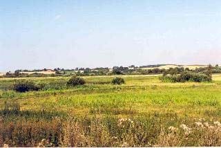 Set fra Hallebyorevej: På den anden side af Åmosen markerer kirken sig på bakken som et vigtigt element i landskabet.