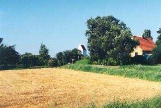Også fra Søvejen kan man på den sidste strækning ned mod Tissø se ind over de bølgende marker til byen markeret af kirken.