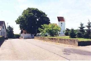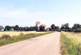 Set fra Søvang: Kirken ligger i landsbyens udkant og kirkemuren definerer den præcise