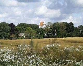 Kort før ankomst til byen ad Nøragervej, trækker trækronerne sig til side og giver kirketårnet plads til at bryde frem.
