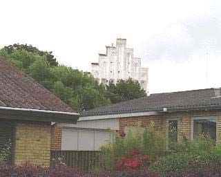 Fra Skippingevej knejser kirketårnet flot over byen. Kirken glider dog i dette modlysbillede i