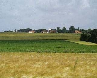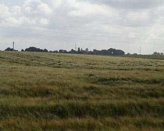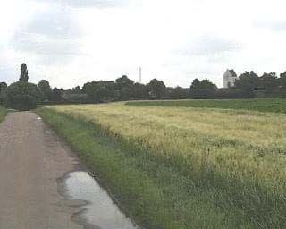 Fra Støvlemosen i nord lader kirkens sig helt skjule af terræn, træer og bygninger.