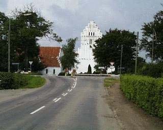 Ved ankomsten til landevejen træder kirken i karakter i et flot frontperspektiv.