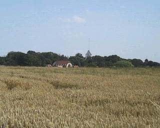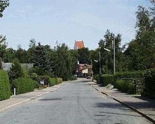 Fra Møllevej i nordøst har kirketårnet tabt kampen til terræn og træer. Et betydeligt