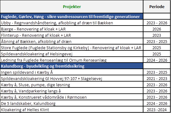 Nedenfor er vist en skematisk opstilling af planlagte projekter m.m. Det samlede anlægsbudget for nedenstående projekter er ca. 100 mio. kr. i perioden 2023 – 2026. Herudover er der afsat 130 mio. kr. til byggemodninger og stik samt ledninger til nye kunder.