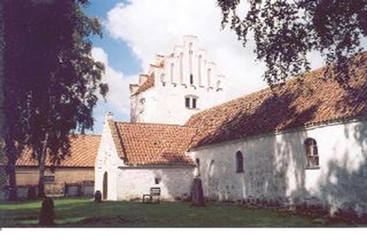 Kig fra nordøst mod Aunsø kirke og i baggrunden Avnsøgård.