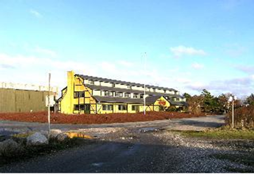 Det ene af de tidligere to store kornpakhuse er genopført efter en brand og fungerer nu som restaurant, fra sydvest.