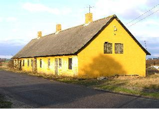 Lang gulkalket længe med flere arbejderboliger, formentlig tidligere tilknyttet kalkværket, fra syd.