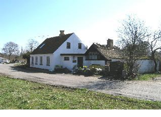 Lille hvidkalket husmandssted med frugthave i den sydøstlige udkant af landsbyen, fra øst.