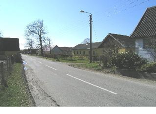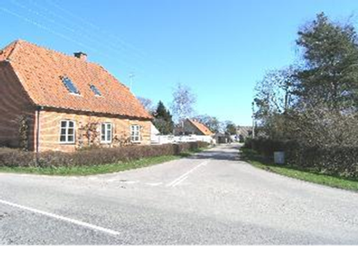 - Gårde og huse spredt langs gaden omkring den åbne grønning i midten af byen