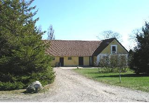 Gulkalket gård med hvide lisener og gesimser på stuehuset, fra nordøst.