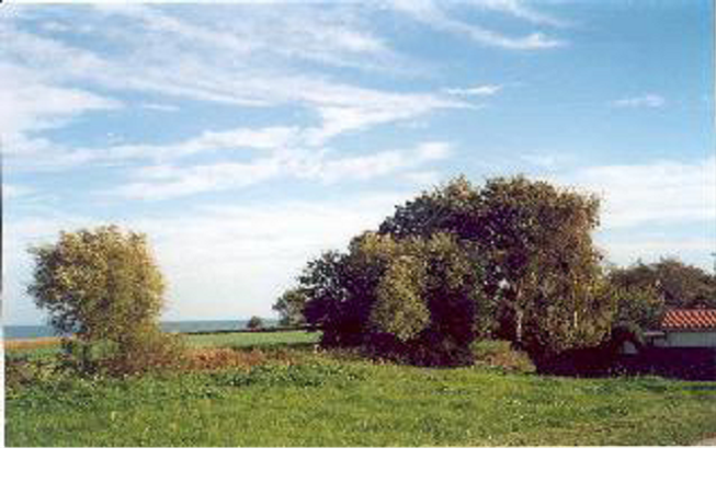 Kig fra engen ved kysten mod landsbyen. Set fra nordøst.