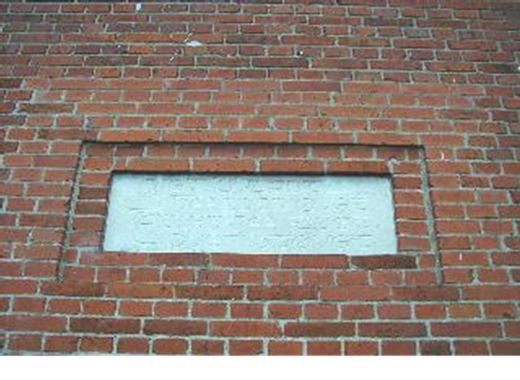 Plade med indskrift på forsamlingshusets facade, fra
